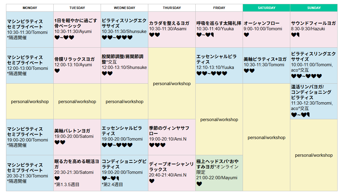 *ブルーがピラティス、ピンクがヨガのレッスンです。